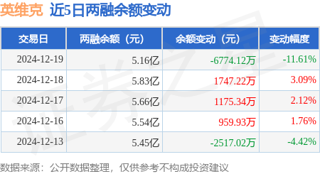 英维克:12月19日融券卖出5.44万股,融资融券余额5.16亿元